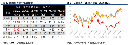 本周AAFC8月报告大幅上调25/26年度菜籽产量至2010万吨,环比增加12.9%,同时将出口目标上调至700万吨,但无法抵消产量上调幅度,因此结转库存被调增至220万吨。AAFC指出,近期良好的降雨形势有利于恢复菜籽种植区域的土壤墒情,因此单产预估改善。受中国8月实施的油菜籽进口保证金措施影响,ICE菜籽已经有所下跌,本次产量预测值的上调或进一步导致加菜籽估值承压,目前欧菜籽与加菜籽之间的价差再次来到偏高水平。