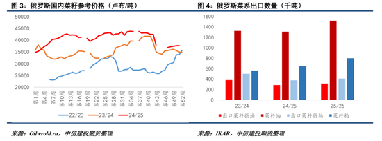 受进口限制影响,来自加菜籽一侧的出口压力或无法体现到内盘上,中国菜系进口将更多依赖俄罗斯、澳大利亚及阿联酋等国。对于菜系而言,最大的潜在利空来自于俄罗斯产区的丰产预期。据IKAR估计,25/26年度俄菜籽有望增产至500万吨以上,对应的菜籽/菜粕/菜油出口潜力在75/152.1/80.4万吨。目前欧盟对俄罗斯的进口限制依然存在,预计俄罗斯菜系出口仍将依赖中国市场。不过,俄罗斯当前旧作可供出口量所剩无几,报价基本结束,而新季上市及压榨仍需较长时间,11月开始才能大量对华出口,集中到华时间或集中在25年1季度。