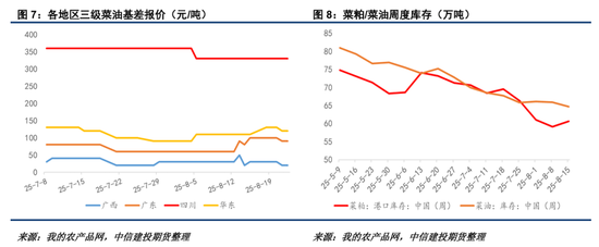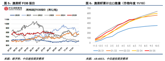 迪拜方面,7月中国对其菜油/菜粕进口数量为2.35/5.13万吨,处于正常水平。受制于压榨产能和旧作库存,11月前迪拜对华出口能力料受约束。目前迪拜菜粕CNF报价仍在355美元左右。澳大利亚方面,其24/25年度截至6月菜籽出口已经达到477万吨,6月出口仅10.2万吨,环比下降84.5%,旧作出口潜力已经不多。预计澳大利亚菜籽最早对华出口装港需至25年11月,考虑到运输、海关商检及入榨需要较长时间,未必能在26年1月前补充中国菜系油粕供应。